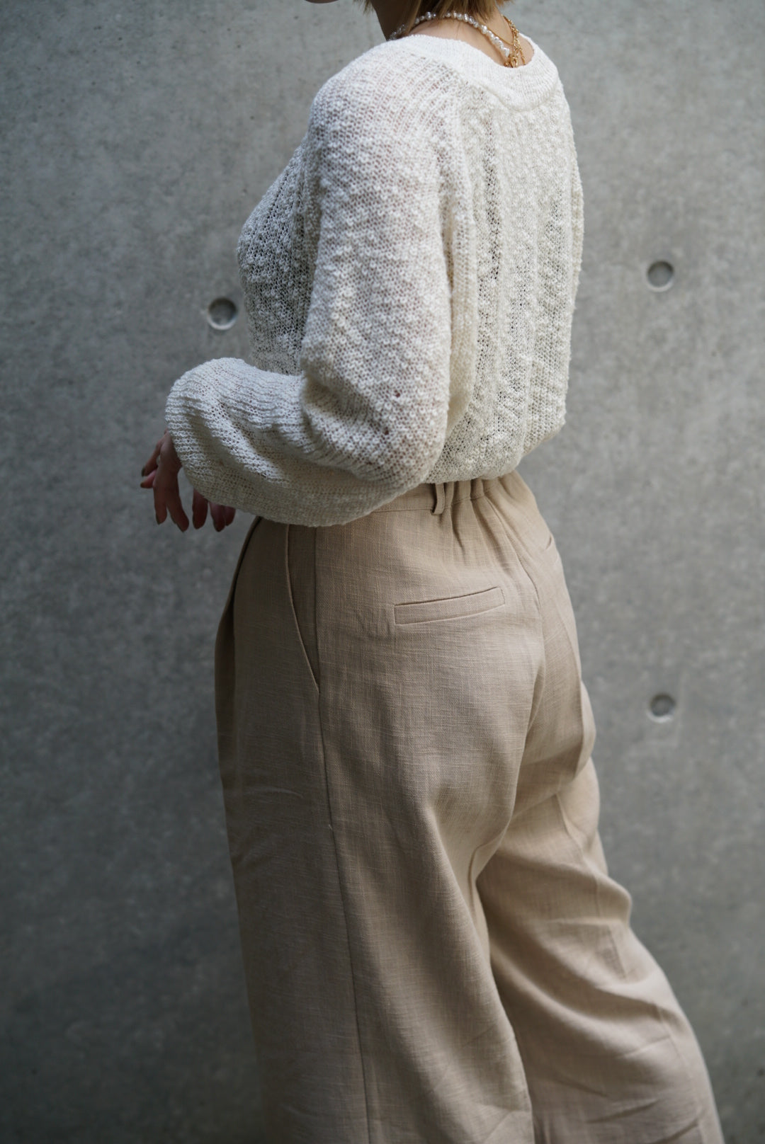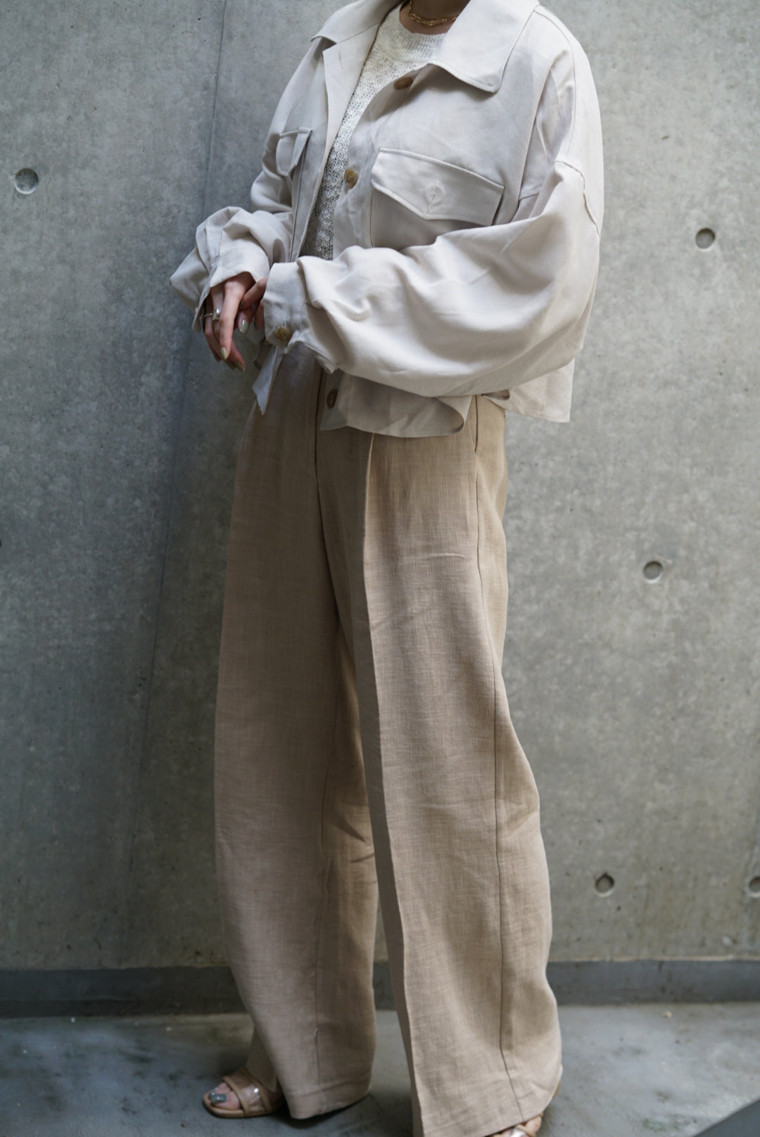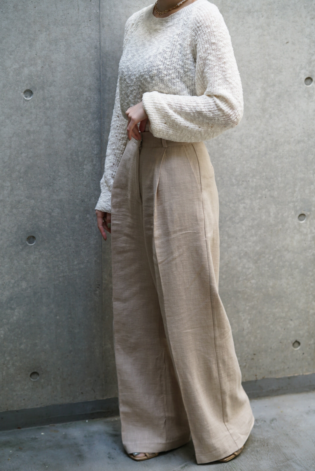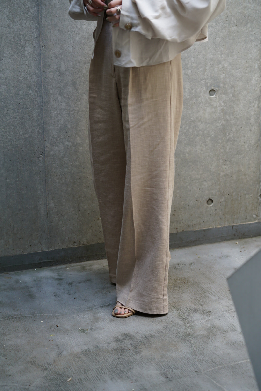 ・リネンライクな風合いが魅力のワイドパンツ。柔らかな素材が生み出すふんわりとした揺れ感が、季節感を引き立てながらリラックスした着心地を提供します。