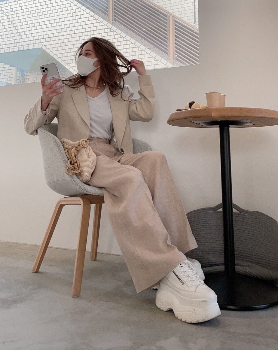 ・カジュアルなスタイリングには、Tシャツやスニーカーを合わせてリラックス感を演出。