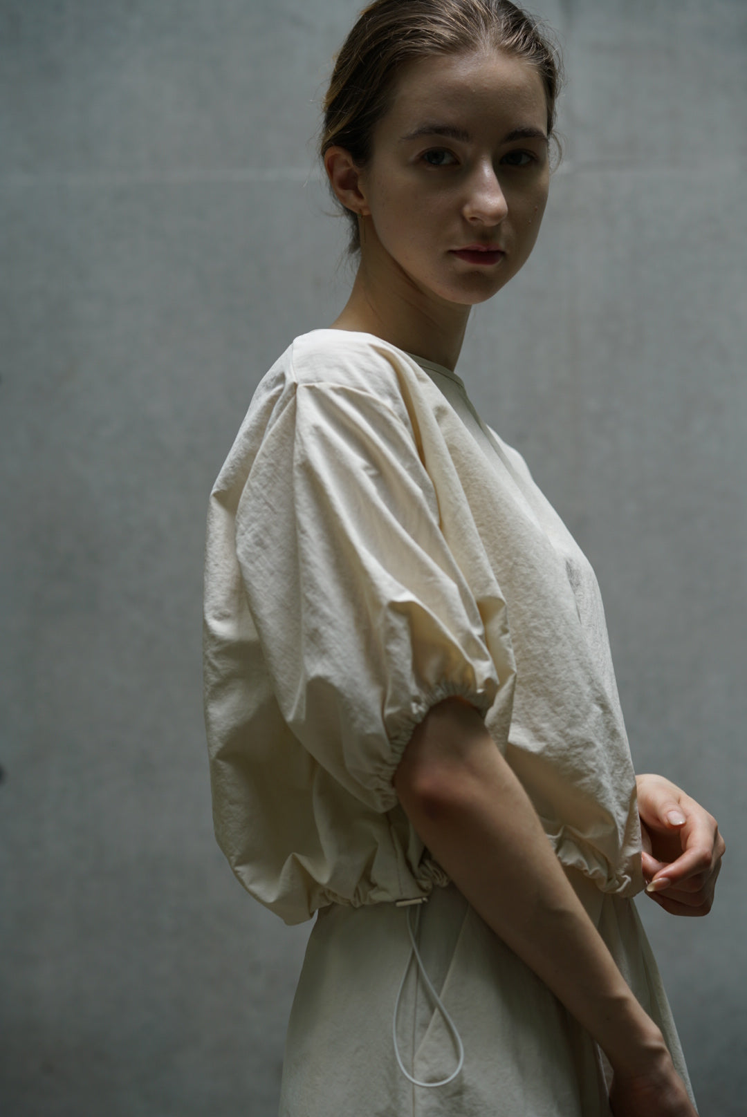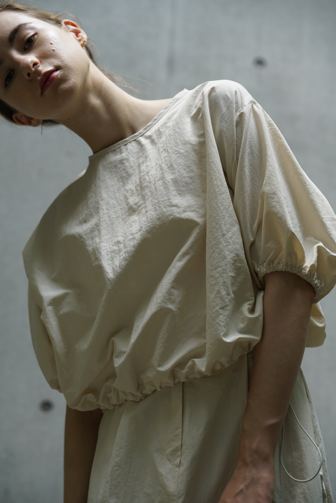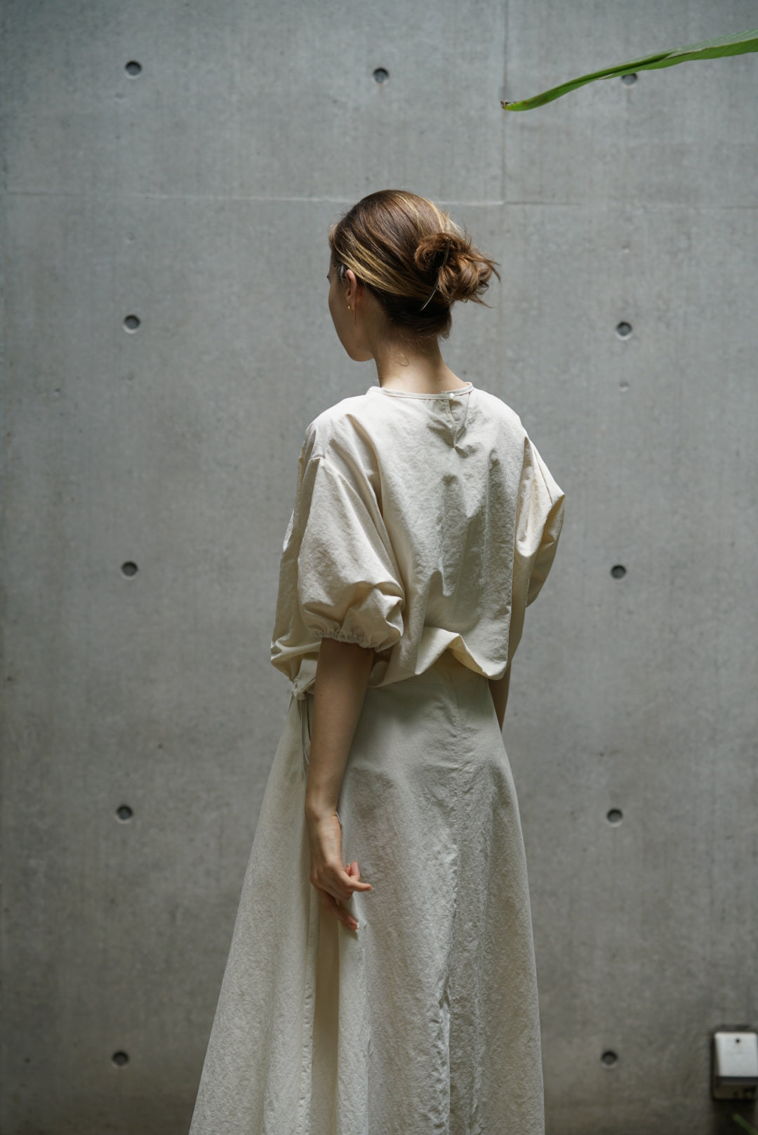 ・袖にボリュームを持たせたブラウスが、女性らしい柔らかいシルエットを演出します。