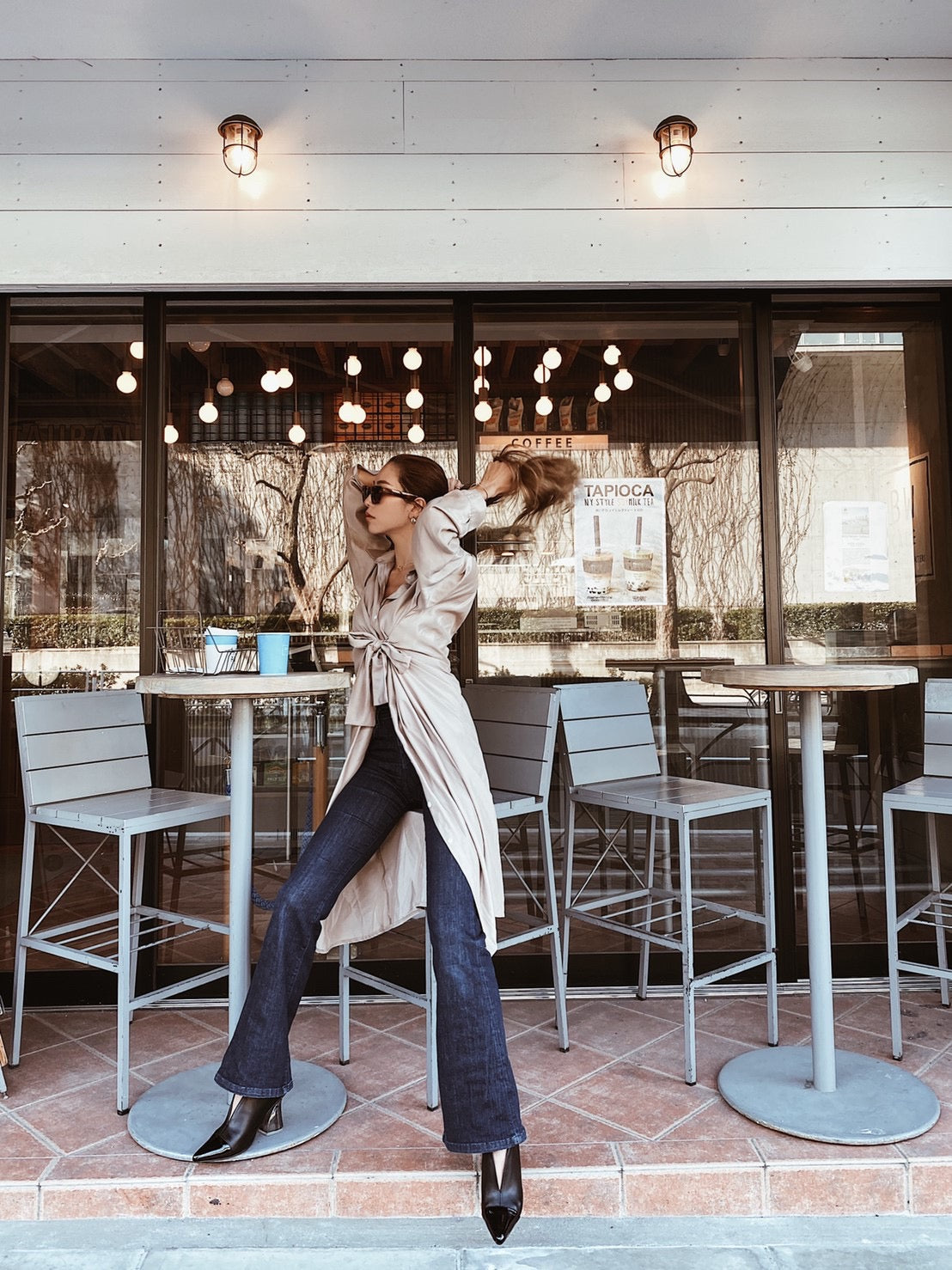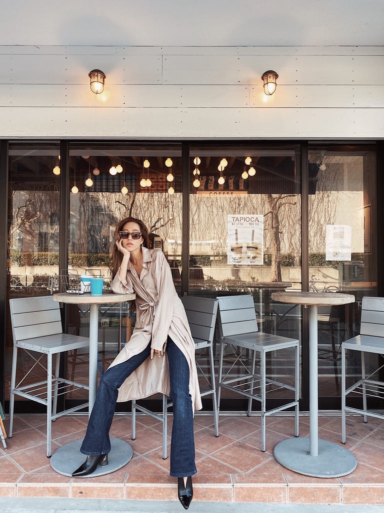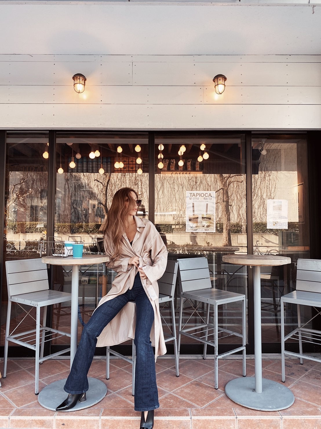 ・スキニーデニムやフレアパンツをレイヤードすることで、こなれたモード感をプラス。